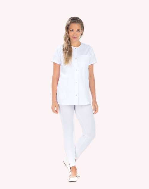Tunique femme, manches courtes kimono, coupe ample, fermeture par pressions, 2 poches basses, 1 poche poitrine, fentes côtés, longueur 75 cm