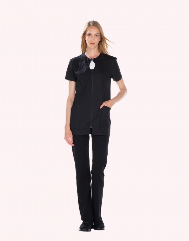 Tunique femme, manches courtes, fermeture par ZIP, 2 poches basses, longueur 75 cm