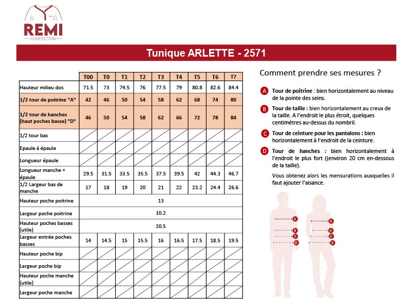Tunique femme, manches courtes kimono, coupe liquette, fermeture par pressions, 2 poches basses, 1 poche poitrine, fentes côtés, longueur 75 cm