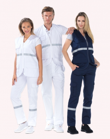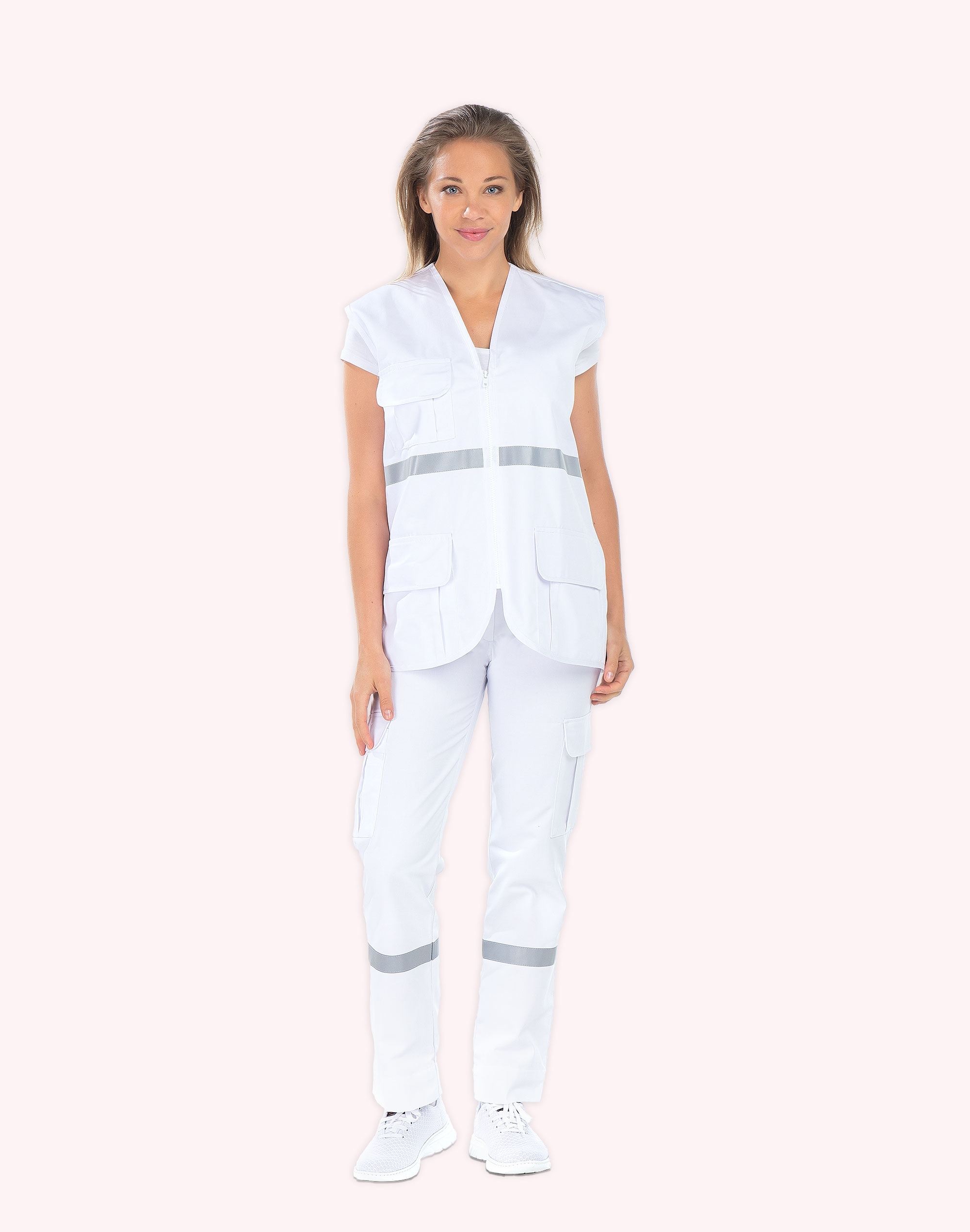 Gilet ambulancier, sans manches, fermeture par zip, 3 poches à rabat fermées par velcro, bande rétro-réfléchissantes de 30 mm, longueur 75 cm
