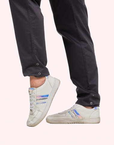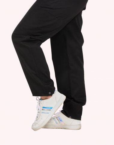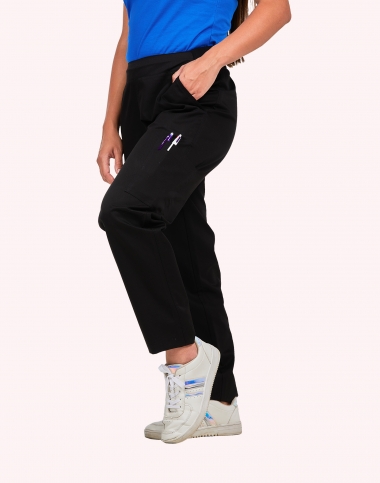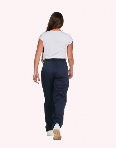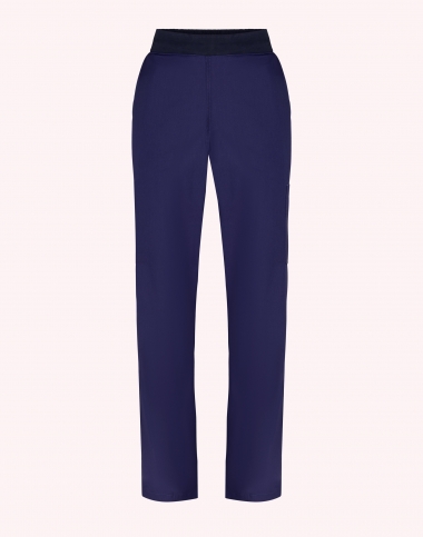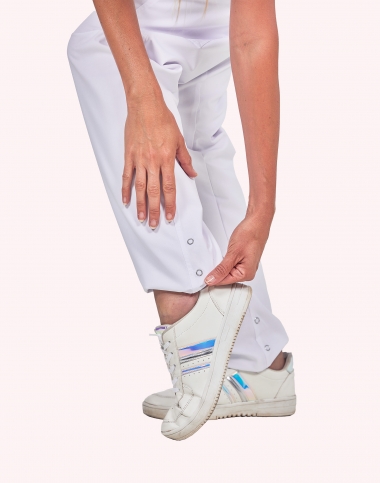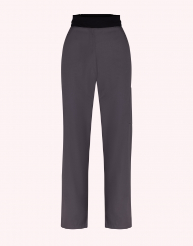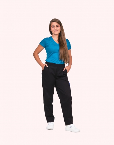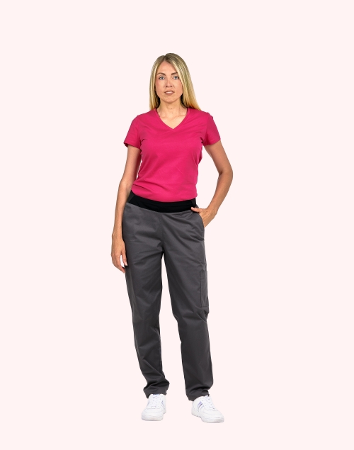 Pantalon femme, ceinture en maille élastique cotés et dos, ventre plat, cordon de serrage intérieur, 2 poches italiennes, 1 poche cuisse, 1 poche arrrière passepoilée, longueur réglable par pressions, longueur d'entrejambe 80 cm