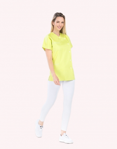 Tunique femme, manches courtes kimono, fermeture latérale par pressions, 2 poches basses, 1 poche poitrine, fentes côtés, longueur 75 cm