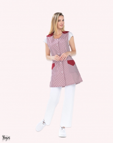 La modèle NADEGE, c'est une tunique de ménage ample sans manches, conçue en tissu léger, qui accompagne vos journées de travail avec une aisance remarquable. Les fentes latérales offrent un confort optimal, tandis que les deux poches basses permettent de garder vos accessoires essentiels à portée de main. La fermeture par pressions simplifie l’enfilage et assure un maintien pratique et rapide. Disponible en motif vichy, elle combine fonctionnalité et élégance discrète pour le personnel d’entretien et les agents de nettoyage.