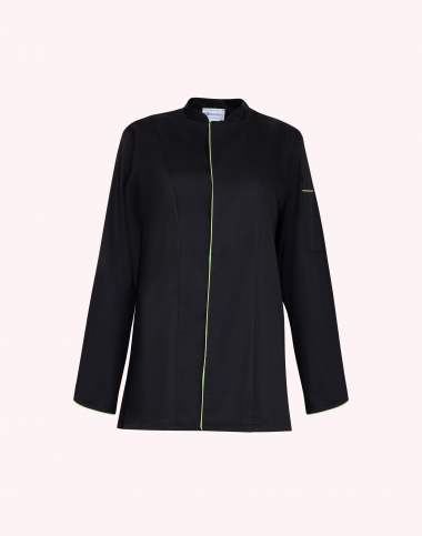 Veste de cuisine, manches longues, fermeture par pressions sous patte, 1 poche poitrine intérieure, 1 poche stylo sur manche gauche, fentes côtés, longueur 75 cm